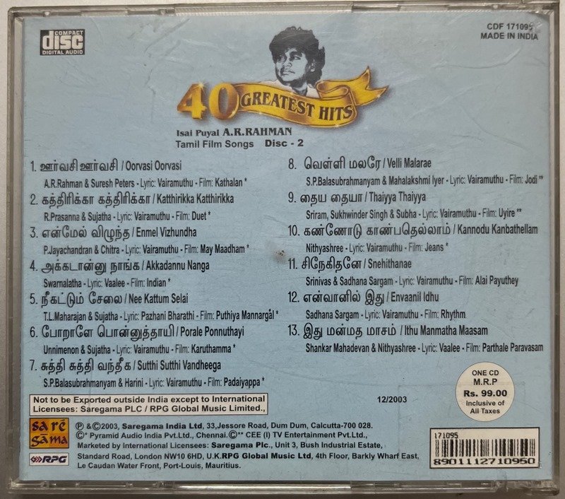 40 Greatest Hits Of A.R. Rahman Disc 2 Tamil Audio CD Conditions