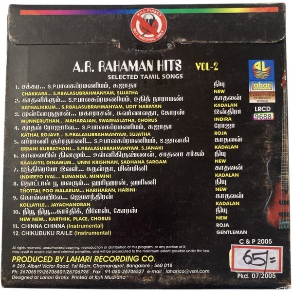 Ideal for collectors and fans of classic A.R. Rahman Tamil hits.