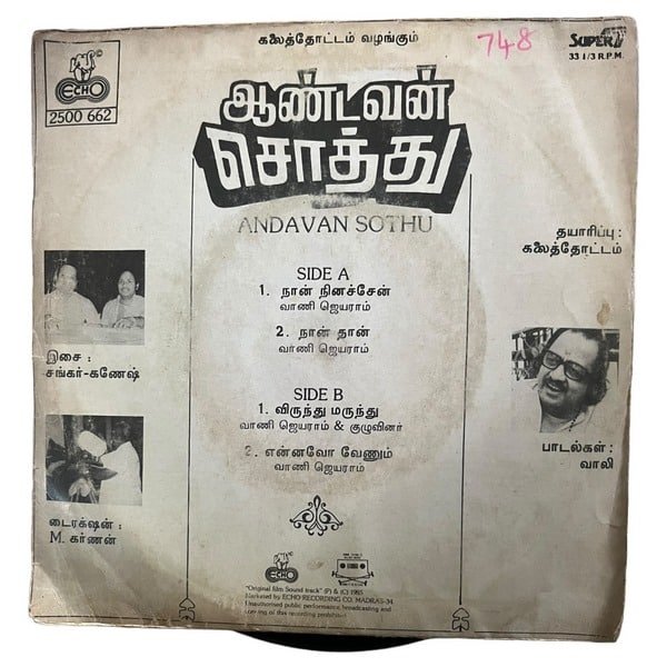 Aandavan Soththu Tamil Vinyl EP Records By Shankar Ganesh