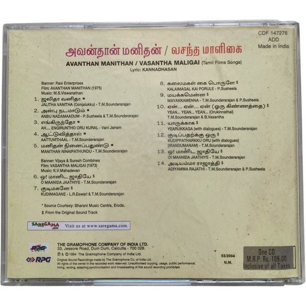 Avanthan Manithan, Vasantha Maaligai Tamil Audio Cds