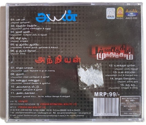🎬 Presenting a power-packed 3-in-1 Tamil audio CD combo featuring Ayan, Anniyan, and Pachai Kili Muthucharam.
