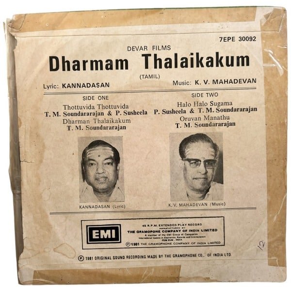 Dharmam Thalaikakum Tamil EP Vinyl Records By KV Mahadevan