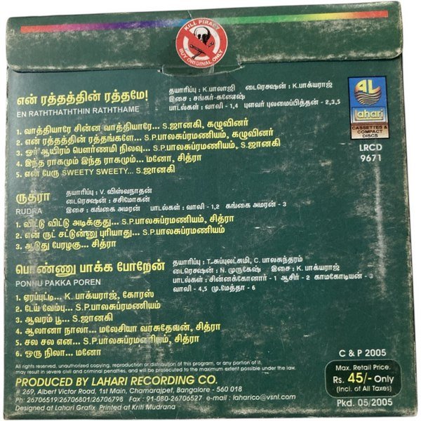 En Rathathin Rathame / Rudra / Ponnu Pakka Poren Tamil Audio CD – Vintage Tamil Movie Songs Collection
