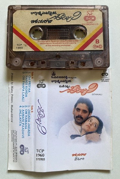 This is an original audio cassette of the iconic Telugu film Geethanjali, featuring mesmerizing compositions by Ilaiyaraaja.