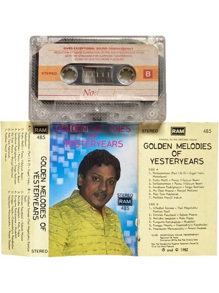 Vintage Tamil hits compilation Golden Melodies of Yesteryears featuring classic film songs from the golden era. A collectible RAM label cassette.