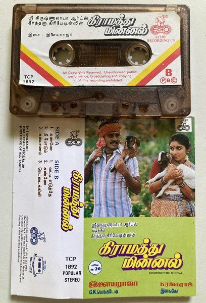 This is an original vintage Tamil audio cassette of Gramathu Minnal, featuring music composed by Ilaiyaraaja.