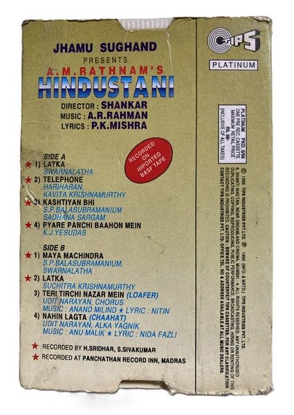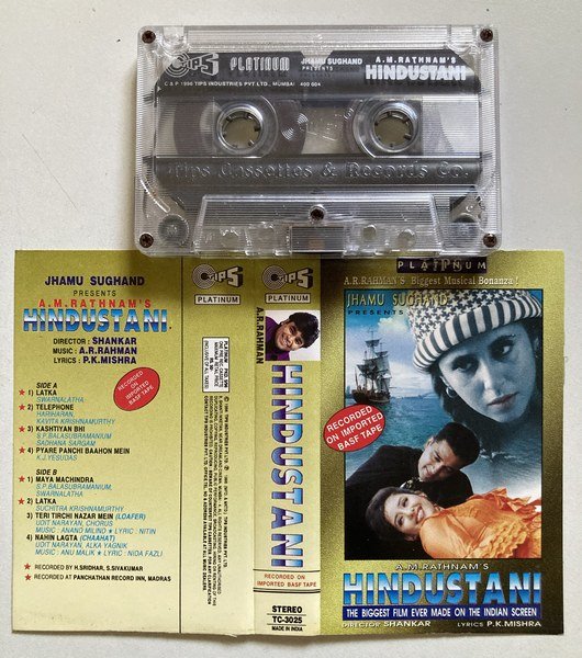 🎶 Hindustani – Hindi Audio Cassette is a powerful and patriotic soundtrack composed by A.R. Rahman, known for its energetic compositions and emotional depth.