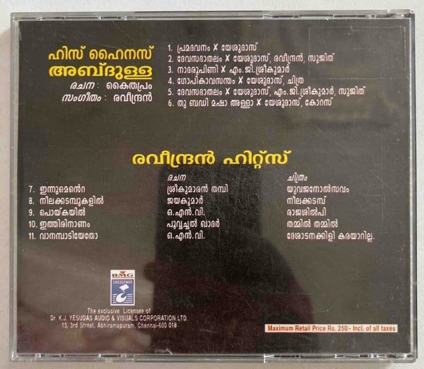 His Highness Abdullah & Film Hits Malayalam Audio CD Condition