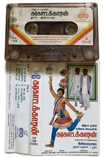 This is an original Tamil audio cassette of Karagattakaran, featuring iconic folk-based compositions by Ilaiyaraaja.