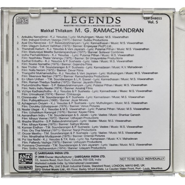 Legends – MGR – Vol 5 Tamil Audio CDs