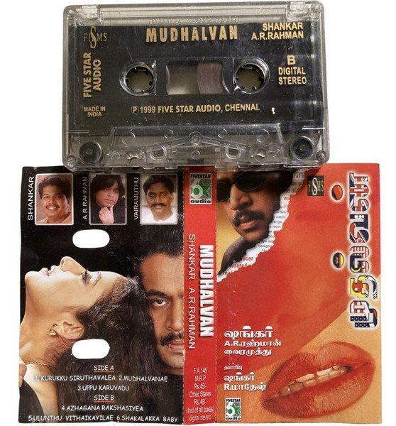 This is an original Tamil audio cassette of Mudhalvan, featuring music composed by A.R. Rahman and directed by Shankar.