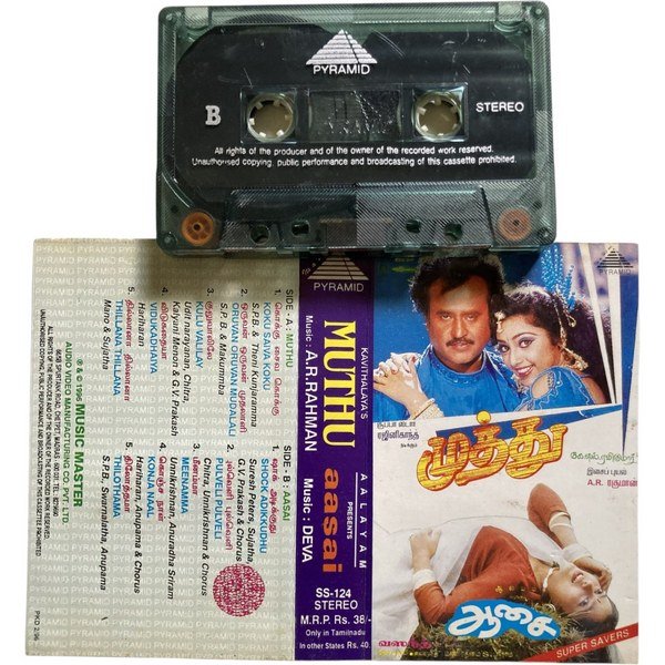 This is an original Tamil audio cassette featuring songs from Muthu (A.R. Rahman) and Aasai (Deva).