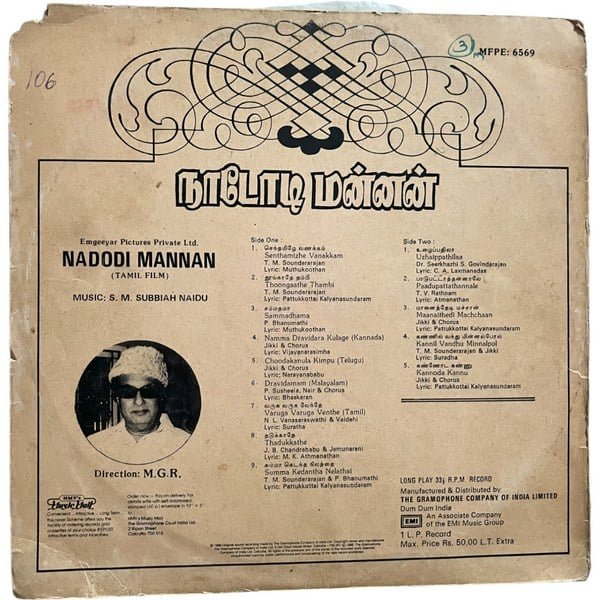 Nadodi Mannan Tamil LP Vinyl Records SM Subbaiah Naidu