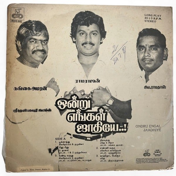 Ondru Engal Jaathiye Tamil LP Vinyl Records By Gangai Amaran