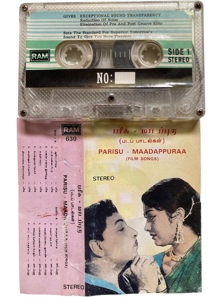 Original vintage Tamil audio cassette featuring songs from the films Parisu and Maadappuraa.