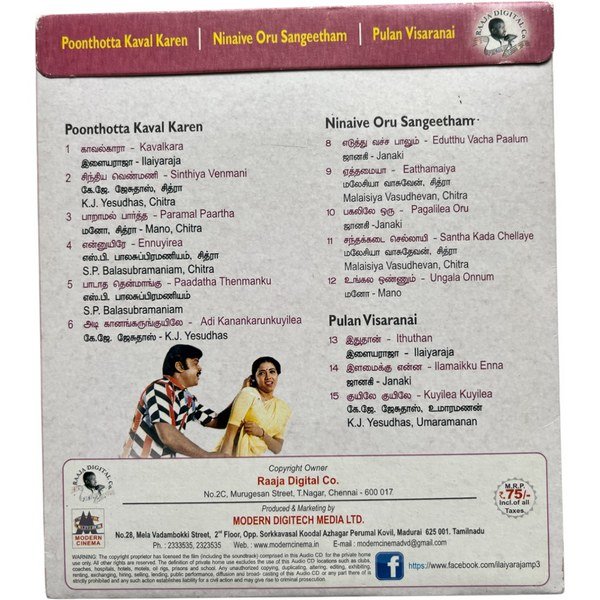 Poonthotta Kaval Karen, Pulan Visaranai, Ninavil Oru sangeetham Tamil Audio Cds By Ilaiyaraaja