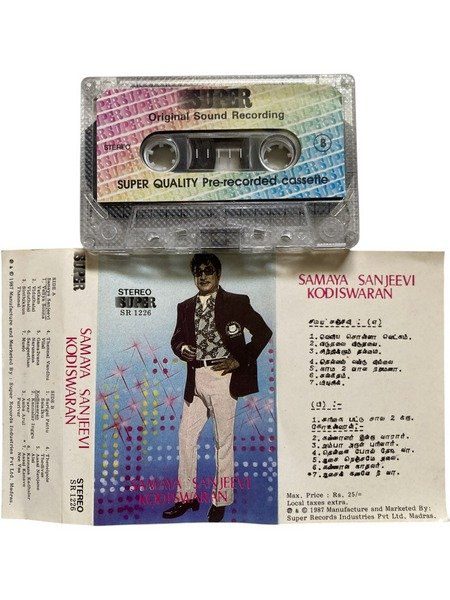 Original Tamil audio cassette of Samaya Sanjeevi Kodiswaran, a vintage film songs release from the Super label. A rare collectible from the 1980s Tamil cinema era.