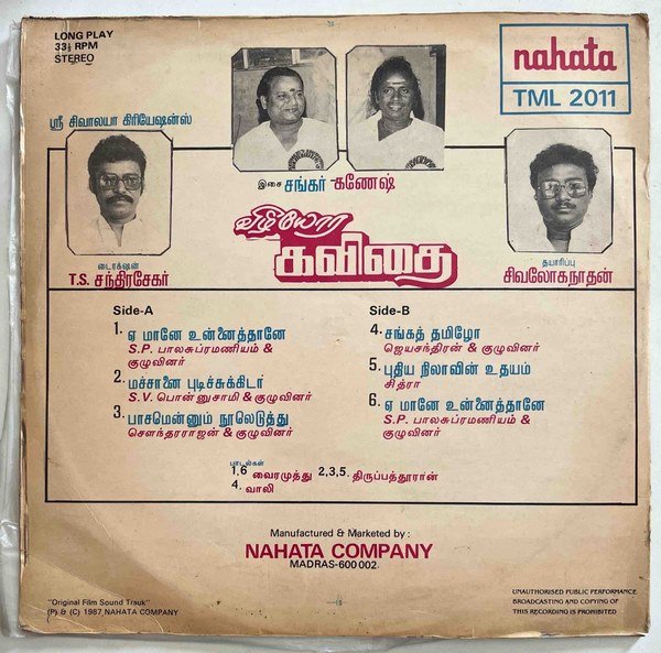 Vizhiyora Kavidhai Tamil LP Vinyl Records By Shankar Ganesh